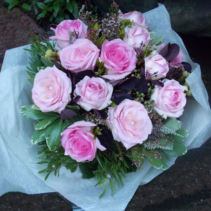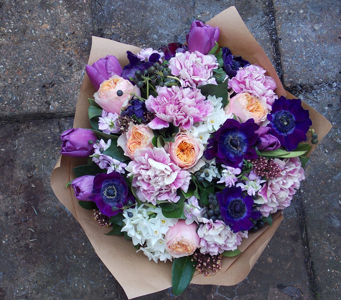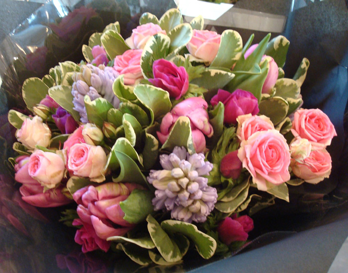 Mini-eden spray roses, pink tulips, anemonies and hyachinths